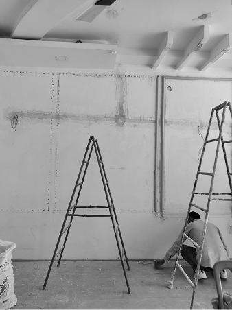 Two beds with a central study space—yellow triangles divide the room, yet unite it as one.